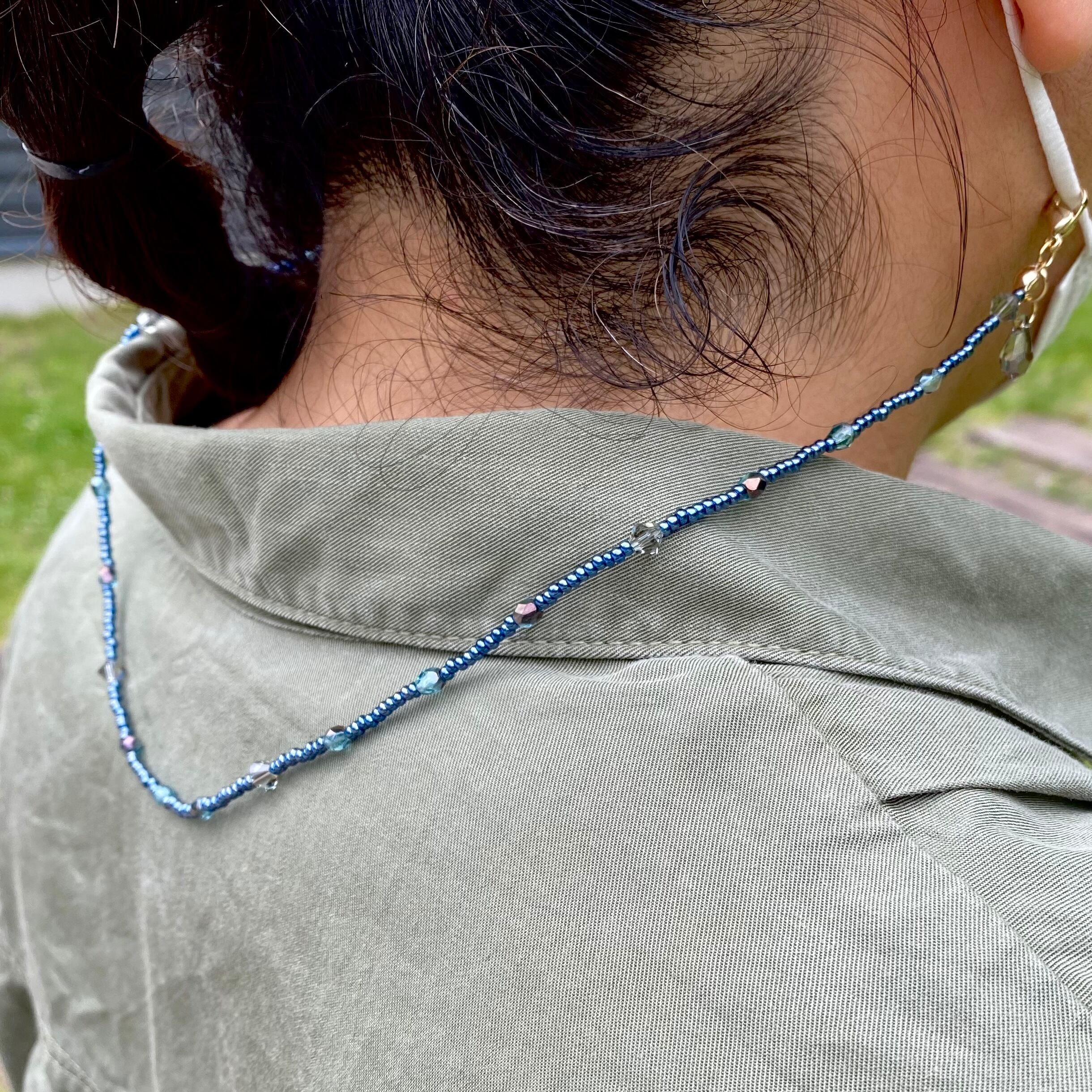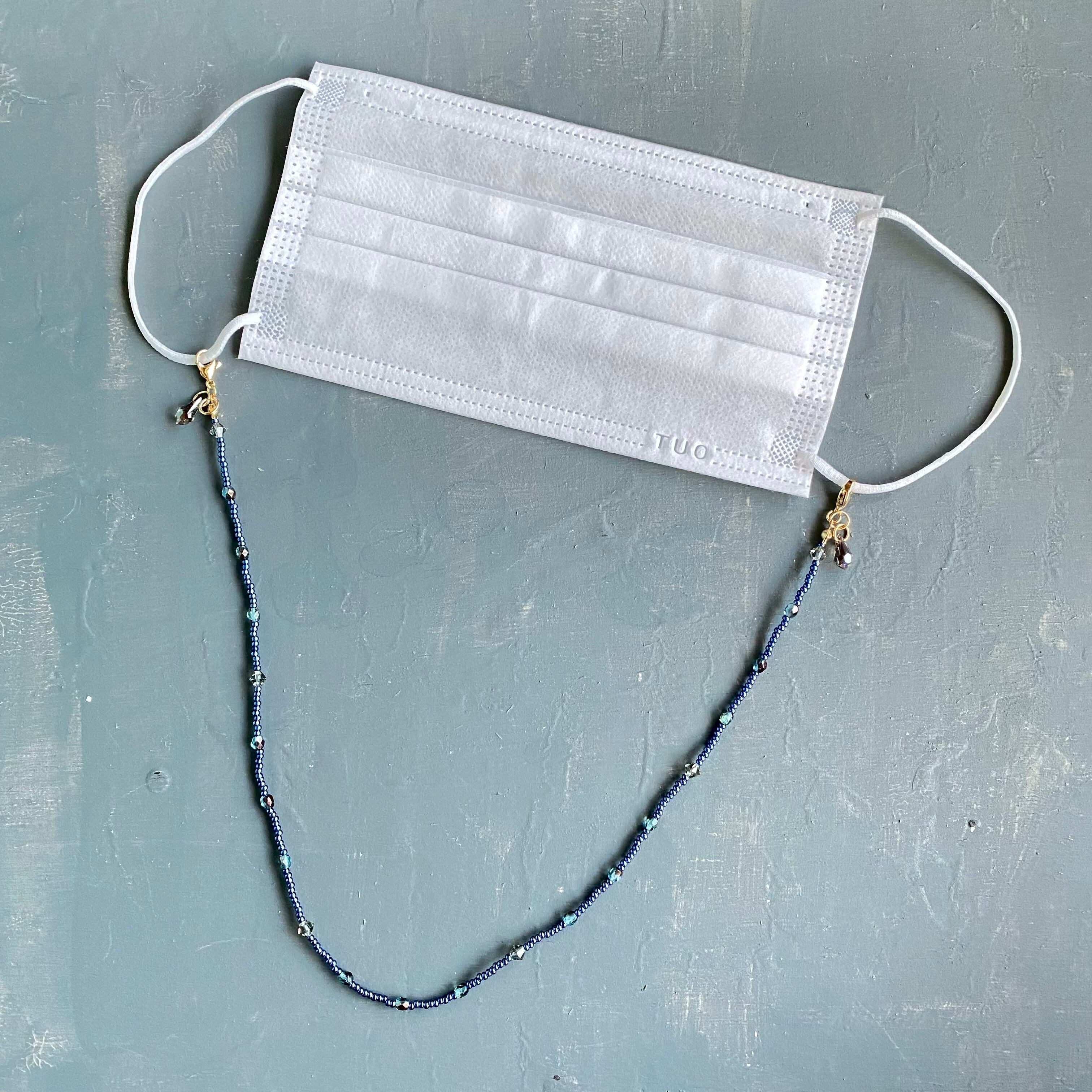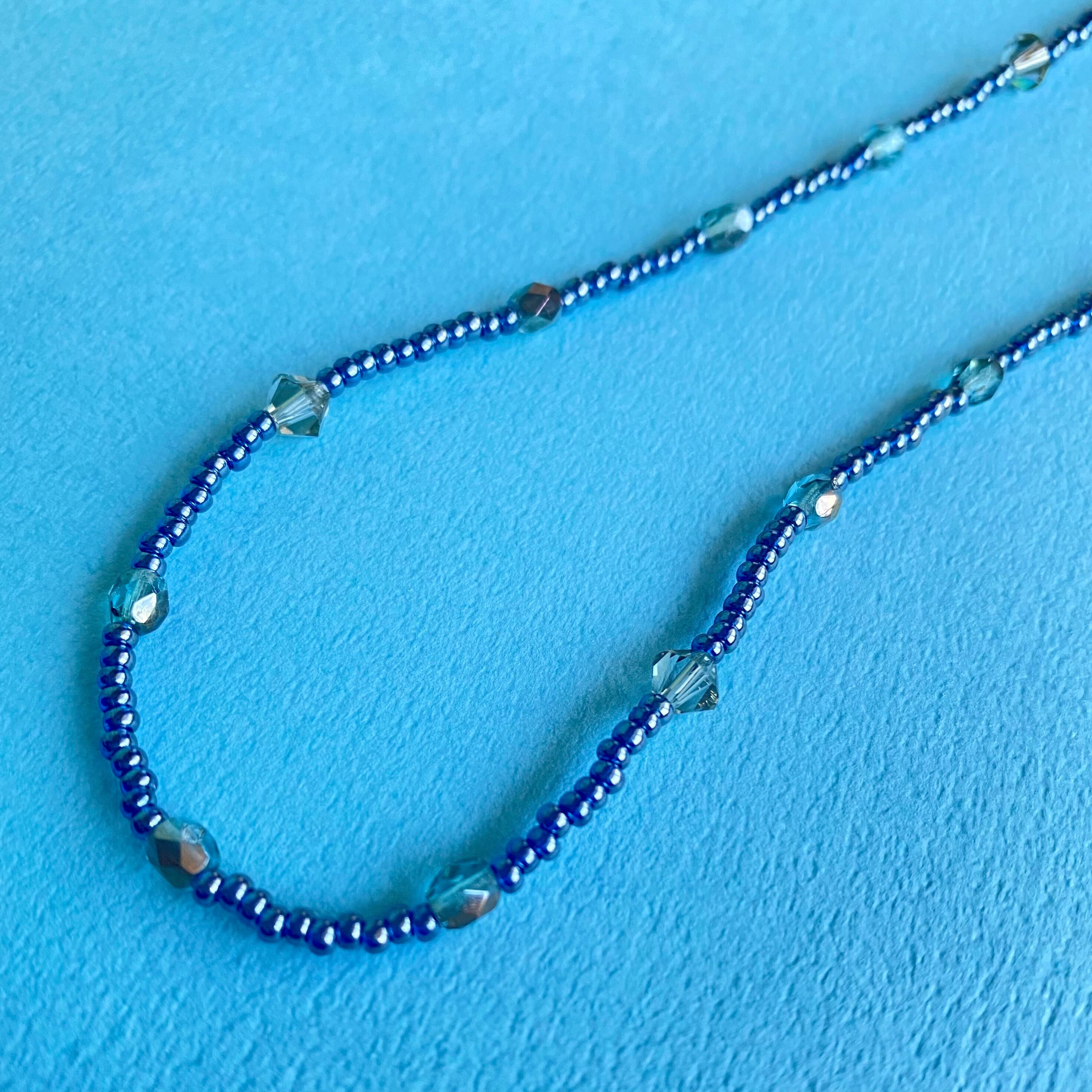 キラリと光るブラックのスワロフスキーと、深いブルーのチェコビーズがポイントです。